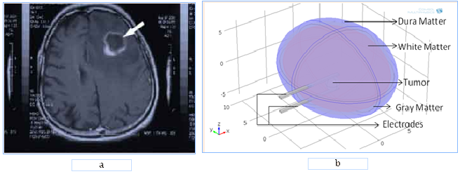 A three-dimentional (3D) model consisting of the human brain, tumor tissue and electrodes was developed to study electric field distribution. Figure 1a shows a brain tumor configuration.11 This is modeled as shown in Figure 1b. Here, the upper electrode (positive) and the lower electrode (ground) are used to apply voltages. The electric field distribution using two needle electrode and microneedle electrode array was studied. The dimensions of model components along with the voltages applied in each case (to obtain a nominal value of 1200V/cm7) are listed in Table 1 and the electrical parameters in Table 2.12