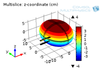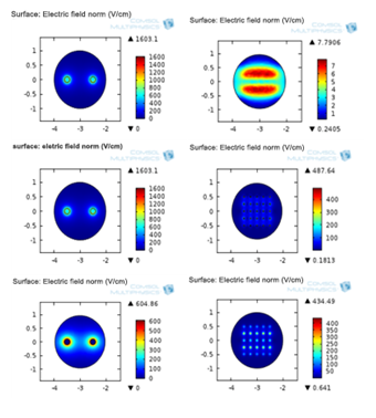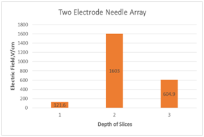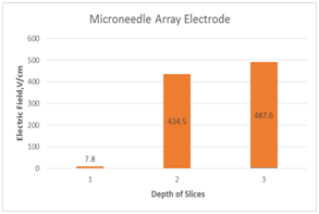 Figure 3 shows a typical distribution of the electric field along the depth using microneedle array electrode. The electric field intensity varies from a lower value at the bottom to a higher value at the top. It is the highest at the tip of the needles. The variation of the electric field distributions for the two electrode configurations, namely, the two needle, and microneedle array electrodes, are shown in Figures 4a-4c, at the 0.25cm, 0cm, and -0.25cm slices respectively (the slices were cut at 0, 0.25, 0.5, 0.75, -0.25, -0.5, and -0.75cm). The electric field intensity is the highest at 121.6V/cm for the two needle electrodes and 7.79V/cm for the microneedle array electrodes, at +0.25 cm slice. At 0cm, the maximum electric field intensities for these electrode configurations are, 1603.1 and 434.49V/cm, respectively. The electric field intensity is highest at the needle configuration due to the sharp edge of the needle. The electric fields at -0.25 cm slice are, 604.86, and 487.64V/cm respectively for the two electrode types. This indicates the variation of the electric field intensity along the tumor thickness, maximum being at the surface where the electrodes are placed (in the center of the tumor, at 0cm) and they vary in magnitudes above and below 0 cm, as shown for 0.25cm and -0.25cm. Figure 5 shows a comparison of average electric field for the two needle electrode at +0.25, 0, and -0.25cm layers along the depth. The variation is highly non-linear from -0.25 to 0 to +0.25 cm depths. It is only 7.6% at +0.25cm, compared to the magnitude at 0 cm, while it is 37.7% at -0.25cm, compared to that at 0 cm. Similar variation is also observed for the microneedle electrode array (Figure 6). In this case it varies to a low 1.8% at the +0.25cm level compared to 0 cm level. However, at -0.2cm level, it is more than at 0 cm level, it is of 112.22% of that of at 0cm level. These variations could be due to the difference in the electrode geometry and their penetration into the tumor thickness at various slice levels. The applied voltage can be varied to obtain desired field intensities.