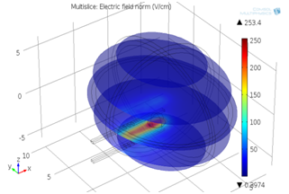 In order to determine the electric field distribution inside the tumor and other layers of brain, a three-dimensional finite element model (Figure 2) was implemented in the COMSOL software package (COMSOL Multiphysics, V.4.3b; Stockholm, Sweden). COMSOL solves a series of equations for solving the given problem. The governing equations that COMSOL uses to compute electric field (E) are given as follows: