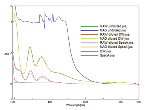 Spectroscopy is performed with a Jasco Inc. (Tokyo, Japan) V-650 Spectrophotometer. Standard resolution spectra are obtained using the following parameters and settings: bandwidth 2.0nm, response fast, 900-190nm spectra, scan speed 2000nm/min, no correction, data interval 1.0nm, 10 accumulations, standard 10mm cell holder attachment using a 1mm quartz cuvette. Spectra of MAG & RAW are obtained in undiluted solution, analyzed diluted in spectroscopic grade alcohol (Sigma-Aldrich, St. Louis, MO, USA) denoted (SpecA) for convenience, and analyzed diluted in distilled water (DW). Dilutions are performed by putting 50μL of sample (MAG or RAW) into 450μL of solvent into ~500μL 1mm pathlength quartz cuvette. Additionally, high resolution spectra are obtained with parameters as described above but with bandwidth 0.1nm, speed 100nm/min, baseline correction, data interval 0.05nm, no accumulation for MAG & RAW undiluted, and with DW dilution (50μL into 450μL) & SpecA dilution (10μL into 490μL). Hi-Resolution data (0.1nm bandwidth) is summarized by subtracting the RAW from the MAG spectra signal for each solvent using JASCO's Spectra Analysis Algorithm Subtraction function so that differences can be readily visualized. The MAG-RAW spectral difference plot examined over 190 to 900nm is expected to be zero for wavelengths where no absorbance difference is seen (RAW=MAG so MAG-RAW=0), positive where RAW>MAG and negative for wavelengths where the absorbance of MAG<RAW.