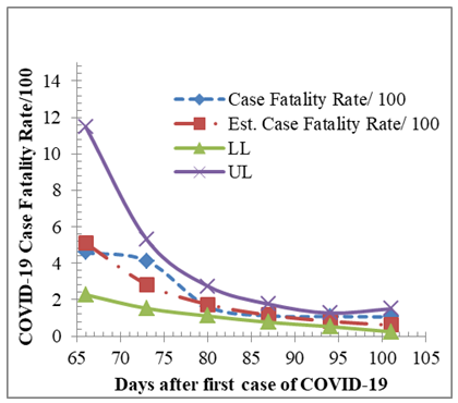 The state-wise trends of COVID-19 in Case Fatality Rate per 100 cases (Cured + Deaths) have been studied in Indian states. COVID-19 Case Fatality Rate (CFR) followed Modified Logistic Regression Model as:
