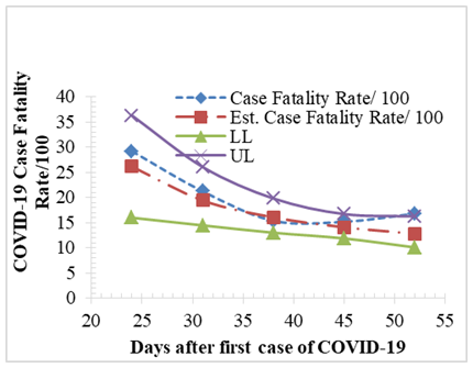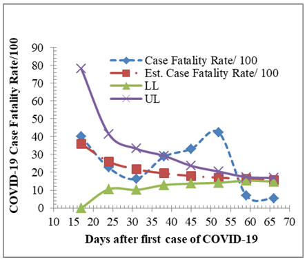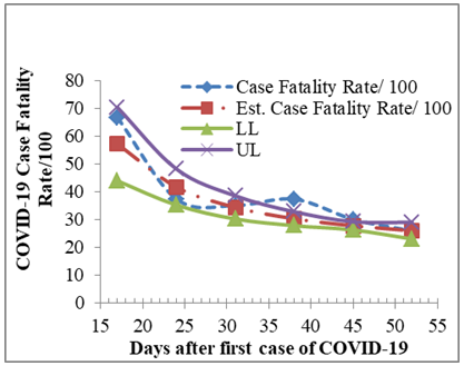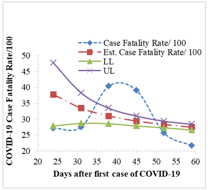 Figure 3a, reveals that average COVID-19 Case Fatality Rate in Maharashtra could be computed after 20 days of first case with Case Fatality Rate around 22 per 100 (cured + deaths). COVID-19 Case Fatality Rate remained constant up to 5 days. Thereafter, Case Fatality Rate increased two-fold in subsequent 10 days, thereafter, Case Fatality Rate decreased consistently up to 60 days, at around 21 per 100. The observed Case Fatality Rate did not remain in 95% Confidence Limits of the estimated Case Fatality Rate (Modified Logistic Regression Model).