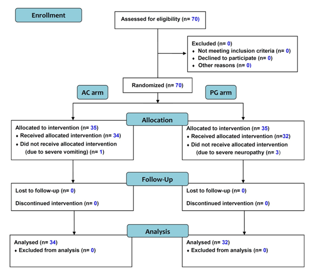 All patients were Iranian ethnicity and median age was 45.3 (28-70) years. In the AC and GP arms, median ages were 47.4 (32-70) and 43.2 (28-68) years, respectively. The difference was not statistically significant.