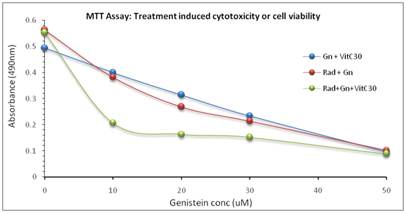 To determine the impact of Vitamin C supplement on genistein-induced apoptosis in radiation sensitized LNCaP prostate cell lines, the cells were first irradiated with very low dose radiation (VLDR); and immediately subjected to genistein and/or vitamin C treatment. Treated cells were analyzed with various bioassays-MTT, NBT, and AO/ EB fluorescence microscopy, as described previously.