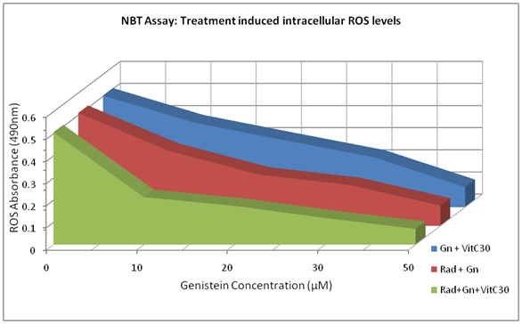 Cells have many defense mechanisms against effects of reactive oxygen species (ROS). In this assay, superoxide ions (O2-) and/or hydrogen peroxides generated by X-rays and/ or graded genistein and or vitamin C treatments reduced or converted NBT to NBT diformazan. SOD reduces the superoxide ion concentration and thereby lowers the rate of NBT-diformazan formation. In this experiment, the treated LNCaP cells, as previously described above (with irradiation, Gn, Vit C) were subjected to NBT assay. The extent of treatment-induce reduction in the appearance of NBT diformazan is a measure of SOD activity present in the cancer cells. Since the absorbance at 490nm is proportional to the amount of superoxide anion (ROS) formed, the SOD enzyme as an inhibition activity can be quantified by measuring the decrease in the absorbance at 490nm, whereas an increase in absorbance reflects treatment-induced elevation of intracellular ROS produced by the cancer cells as demonstrated by Oseni et al.12
