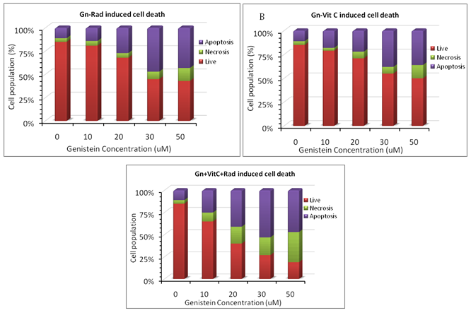 The overall result indicated that the triple combination treatment (Rad-Gn-VitC) was the most effect in apoptosis induction and ROS inhibition. The present study indicates the potential clinical significance of vitamin C supplementation in radiotherapy and radiation-genistein combination phytotherapy.