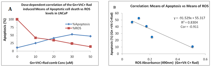 The results/data obtained indicated dose-dependent treatment-induced apoptosis induction (Figures 3 & 4). At all dosage levels, the inter-treatment group differences were significant (P<0.01). It appeared vitamin C significantly augmented apoptosis induction in the combination treatment groups/cells (Figures 3 & 4). The data further indicated a significant negative correlation between treatment-induced apoptosis induction and ROS production (r=-0.83; r2=0.911; P<0.01) (Figures 5A & 5B). The results showed increasing percentage apoptosis concurrent with decreasing ROS production; implying treatment-induced ROS inhibition. The overall data showed the significant impact of vitamin C on apoptosis induction, as shown in the combination treatments relative to the control (Figures 1-5).