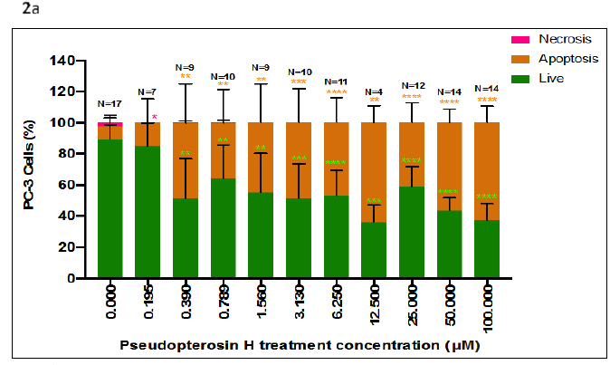 Statistical analysis: An unpaired t-test was used to determine if there was a statistically significant difference between the percentage of live, apoptotic, or necrotic cells PC-3 cells, at the various experimental treatment concentration groups (10), and the negative control 0.000µM) (Graphpad Prism8, San Diego, USA). A linear regression model (95% confidence interval when X=0, Y=0; mean y values at each concentration point) was used to assess the fit of the trend line between the percentage of live, apoptotic, or necrotic cells PC-3 cells and Pseudopterosin H treatment concentration (Graphpad Prism8, San Diego, USA). P≤0.05 was considered statistically significant.