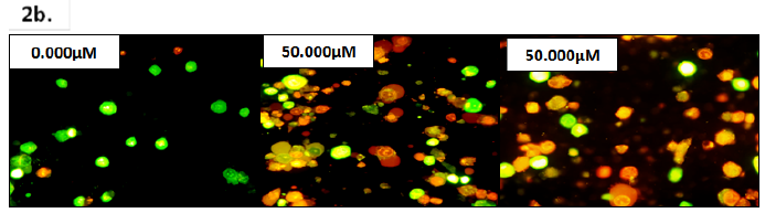 Method: After 48 hours of treatment (PC-3 Cell Treatment protocol), adhered PC-3 cells were dislodged and the supernatant fluid containing the cells was pipetted into microcentrifuge tubes that corresponded to the treatment or negative control groups. The supernatant was then centrifuged for 5 minutes at 3000 RPM. After centrifugation, the supernatant was discarded, and the cell pellet broken with 1ml PBS. This process (5 minutes centrifugation at 3000 RPM, removal of the supernatant, and breaking of the cell pellet) was repeated an additional three times. The AO and EB solutions were prepared as followed: 1mg of acridine orange (AO) per 10ml of PBS and 1mg of ethidium bromide (EB) per 10ml of PBS. 25µl of EB and 75µl of AO solutions were then combined in a separate microcentrifuge tube and vigorously mixed using a micropipette. After the fourth centrifugation process, the supernatant fluid was discarded for a final time and 25µl of the AO/EB solution was added to the remaining cell pellets, then vigorously mixed with a micropipette. Labeled microscope slides for each of the 10 treatment groups and negative control group, was prepared. Once prepared, 20µl of the PC-3 cell and AO/EB solution mixture was transferred onto each slide and covered with a coverslip. The microscope slides were analyzed under the fluorescent microscope (Nikon eclipse E600) with band pass filter at a magnification of 40x. Live, apoptotic, and necrotic cells after treatment were calculated, amongst all trials (N=4–N=17 microscope frames per treatment concentration group or negative control group, amongst two independent trials), as a percentage relative to the negative control (0.000µM) and graphed against treatment concentration.
