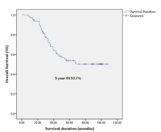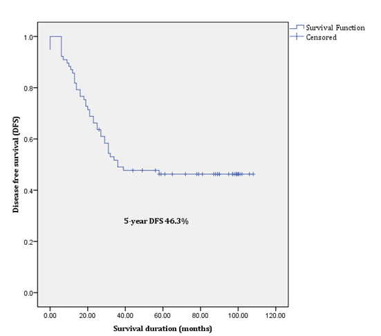 The 5-year OS and DFS of the 77 patients (excluding stage IVB patients) with cervical cancer were 53.7% (95% CI 62.3% to 79.9%) and 46.3% (95% CI 50.7% to 70.8%) respectively (Figures 1 & 2). There were no treatment related deaths.