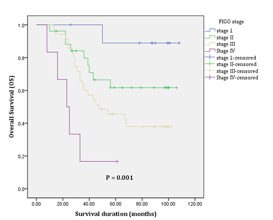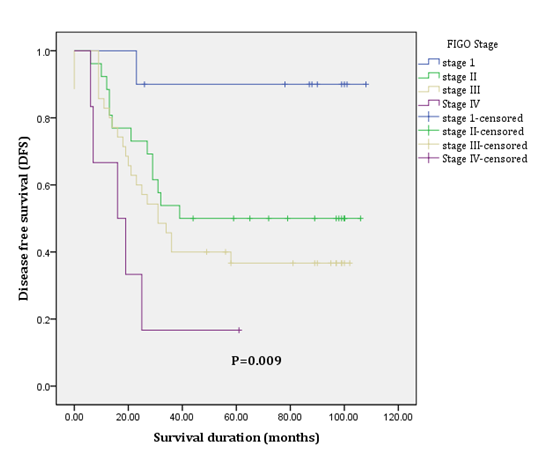 Prognostic factors, such as age, pretreatment hemoglobin level, histology, tumor size, lymph node involvement, FIGO stage, grade and type of initial treatment adopted were analyzed. On univariate analysis, tumor larger than 4 cm (P =0.033), advanced stage (p= 0.001) and surgical resection as an initial treatment (p= 0.034) showed statistically significant decrease in OS. Patients with advanced stage (p= 0.009) had statistically significant poor DFS on univariate analysis (Table 3). Multivariate analysis showed that advanced stage was the only independent prognostic factor for poor OS and DFS; (HR= 3.237; 95% CI= 1.609-6.513; p= .001) and (HR= 2.694; 95% CI= 1.406-5.161; p= 0.003) respectively. Figure 3 & 4 showed Kaplan-Meier analysis of overall survival and disease free survival according to stage.