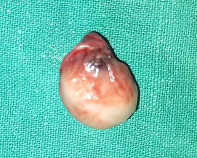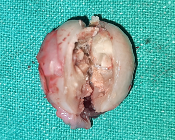Figure 5 Cut-section of the trichilemmal cyst in toto after excision showing irregular soft inner surface with no content.
