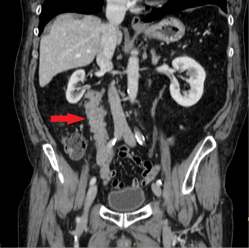 As a result, we present a patient with really atypical dissemination of prostate adenocarcinoma located on the right ureter, confirmed by biopsy, with parallel rising PSA-levels but without any other metastatic disease.