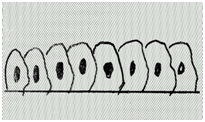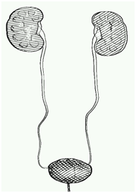 In males, the prostate surrounds a part of the urethra and is located below the bladder (Figure 1). The bladder and both ureters have an inner layer of epithelium (previously known as pseudo stratified) known as transitional epithelium when the bladder is empty the cells appear of multiple levels when the bladder is full and it's wall is stretched , these cells are seen in a single a single row (Figures 2 & 3).