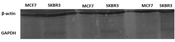 Some investigations determined comparative proteins expression between MCF7 and SKBR3 that are epithelial breast cancer cell lines derived from pleural effusions, of two Caucasian women.7,8 We have previously identified a restricted number of differentially expressed proteins with an immunogenic property between SKBR3 and MCF7 cells using 2-DE and mass spectrometry including glyceraldehyde 3-phosphate dehydrogenase (GAPDH).7,8 We found that, the protein expression level of GAPDH is higher in SKBR3 cell line than MCF7 cell line. Therefore, to confirm these findings we used specific antibody against GAPDH in western-blot experiment (Figure 1). The results of this experiment confirm previous findings that GAPDH expression level is higher in SKBR3 cell line. In conclusion of this study we suggest that in utilization of GAPDH as internal control in western-blot experiments we must consider a large number of factors such as pathological states, different tissues, different cell lines, cell cycle phase, differentiation or proliferation status, age, sex and stress conditions.
