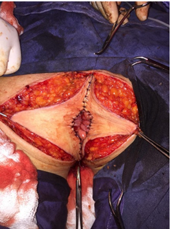 The flap must include part of the subcutaneous cell to allow mobility toward the midline (Figure 8). The union in the midline and mucosa of the anal canal is made by suturing with vicryl 3-0 points separated. (Figure 9) The midline and lateral sectors are closed with separate PDS 3-0 stitches (Figure 10).