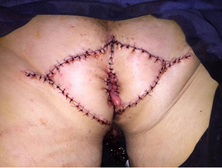 Introduction: Perianal condylomatosis is a common disease that can involve large areas of skin and anal mucosa, making treatment complex. From a surgical point of view, there are several therapeutic options ranging from primary closure to myocutaneous flap rotation.