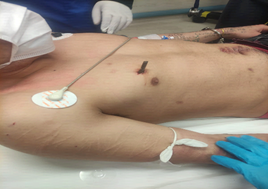 Patient 25 years deprived of liberty, smoker and with a surgical antecedent of a median stab wound in the abdomen. He is transferred by mobile emergency unit with a penetrating chest wound from a prison cut. He arrived at the Emergency Department five hours after the incident lucid, hemodynamically stable with a heart rate of 78 cycles per minute, blood pressure of 130-90 mmHg, respiratory rate of 16 RPM with an oxygen saturation of 98%.