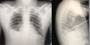 Chest examination revealed the presence of a carcinoma on the anterior aspect of the right hemithorax, mediclavicular line at the level of the 4th intercostal space (Figure 1). An extended FAST was performed, confirming the presence of a right pneumothorax. There was no evidence of free abdominal fluid or cardiopericardial occupation. The radiological pair performed in the emergency room shows an anteroposterior trajectory, from top to bottom with an angle of 30 degrees. The stabbing weapon, 25 cm long, is limited to the right hemithorax and does not appear to contact the right hemidiaphragm (Figure 2).