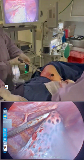 For VATS, a selective intubation of the left main bronchus was performed by the anesthesia team, corroborating its good positioning with fibrobronchoscopy. The patient was placed in left lateral decubitus with the right arm hanging freely in front of the thorax. The surgeon operates from the ventral side of the patient and the assistants are positioned one in front and the other at the patient's side. The monitor is positioned in front of the surgeon and on the back of the patient as shown in Figure 3A.