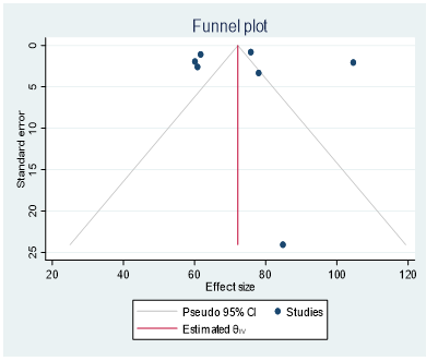 All seven studies dealing with zinc levels reported its association with Hepatic carcinoma, reveals a statistically significant association. Pooled mean for all seven studies was 74.06mg/dL (95% CI: 61.0-87.06) with I2=98.97% as shown in Figure 3. Most studies were located at the outside of the funnel figure, which means that the research publication bias was large. The Egger test showed that the publication bias, as shown in Figure 2.