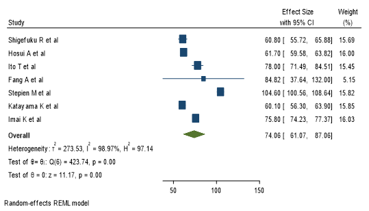 Materials and methods: Meta-analysis was carried out on the findings of seven published studies that were related to zinc with Hepatocellular carcinoma patients. The pooled mean was estimated by using a random-effects model.