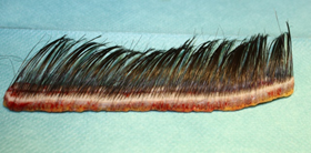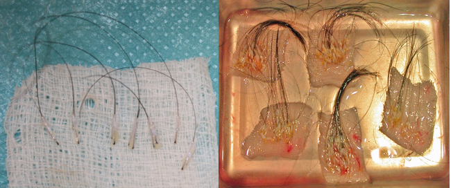 Regarding eyebrow or beard alopecia,24 to achieve a natural aesthetic result, it is important to cut the harvested strip (2 to 3 cms long) into 1-hair FUs. This is easier with the long hair FUL, as it allows for the selection of each appropriate hair and its implantation while respecting the obliquity and orientation.
