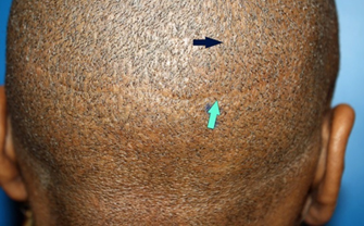 Figure 12 a, b, c Male androgenetic alopecia (stage III) after 2 sessions FUL (7000 hairs) (a, b) The scarline = blue arrow (c).