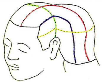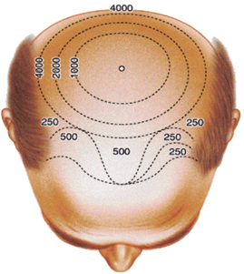 Figure 10 Number of hairs required according to the location and the degree of the bald area to be transplanted.