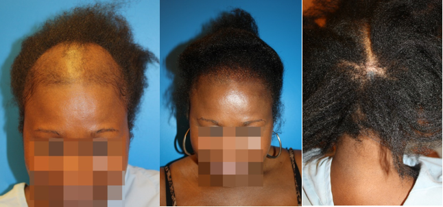 Post-breast cancer androgenetic alopecia22 (Figure 18 a, b, c). Traction alopecia, more common in African-descent, results from repeated hair pulling23,24,25 a definitive fronto-temporo-occipital alopecia may occur. FUL transplant is indicated 6 months after cessation of traction. For the author's experience, curly hair harvesting is easier with FU segmentation (FUT-FUL) than FUE (Figure 19 a, b, c) (Figure 20 a, b).