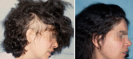 Figure 21 a, b Female post-radiotherapy alopecia for a malignant brain tumor after 1 session FUL (2200 hairs) FUL on both temporal areas.