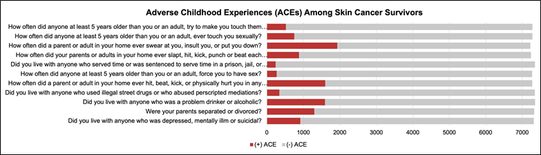 Therefore, this study aims to highlight the potential relationship between ACEs and health-related quality of life (HRQOL) measures among individuals diagnosed with skin cancer. By examining these factors, a more comprehensive understanding of the multifaceted impact of ACEs on skin cancer patients can be attained, potentially leading to improved care and support for this vulnerable population.