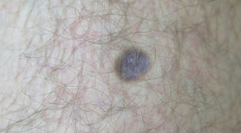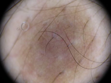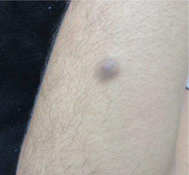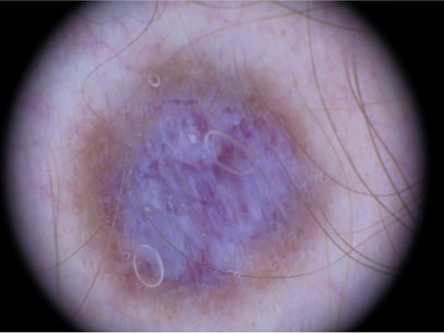 Aneurysmal DF is considered a benign tumor of origin in the dermis and represents less than 2% of dermatofibromas,1-5 it etiology is unknown, it is more prevalent in women over 30 years old. Histopathology gives the definitive diagnosis. The DF is generally larger than the classic DF, has an erythematous-brown or violet color, and can be painful if the lesion grows rapidly. With dermoscopy, we can identify any of the patterns already known to classical DF, but what will suggest that it is an aneurysmatic DF are the linear white structures, vascular structures and delicate pigmented network on the periphery.