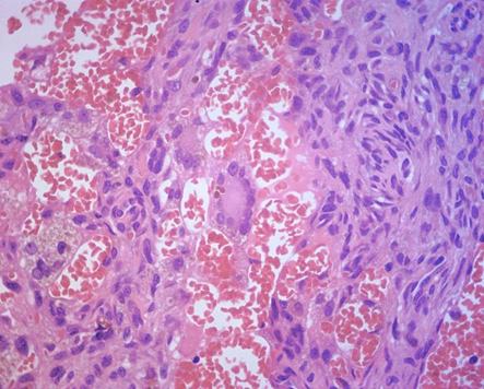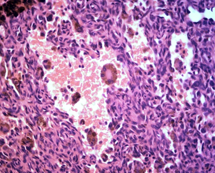 Case 1: A healthy, 25-year-old male patient presented with a hyperchromic, violaceous nodule, measuring an inch and a half, painful and with progressive growth, which had appeared for 3 years and had a positive sign of sunkenness. Dermoscopy identifies a delicate peripheral pigmented network, central wine red area and bright white areas Case 2: the patient was also male, healthy and of similar age, complaining of an arm injury, with progressive increase and starting 2 years ago. On examination, he had a pigmented nodular lesion, measuring 1cm in the right forearm and dermatoscopy showed delicate peripheral pigment network, central erythematous brownish amorphous area and pinkish branched vessels Histopathology of both cases showed acanthotic epidermis and hypercellularity in the center of the lesion, occupying the entire dermis, up to the subcutaneous, forming a fibrohistiocitoid neoplasm, with the presence of giant cells containing brownish pigmentation suggestive of hemosiderin. It also showed cracks without vascular endothelium containing red blood cells in its interior and on the periphery of the lesion, we observed the incarceration of pre-existing collagen fibers, by newly formed collagen.
