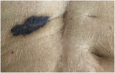 Figure 1 Solitary well defined black colored plaque measuring 05cm X 02cm at 11 o’ clock position from umbilicus in umbilical region.