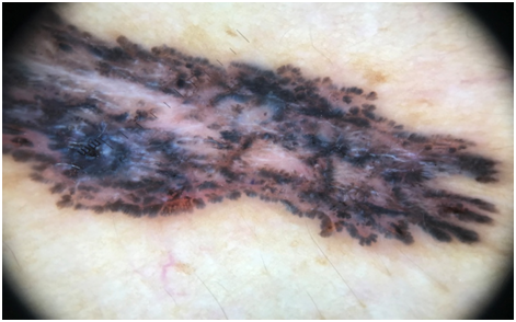 Figure 2 Leaf like areas at the periphery of the lesion, blue grey ovoid nests, absence of pigment network and specks of black and brown pigment.