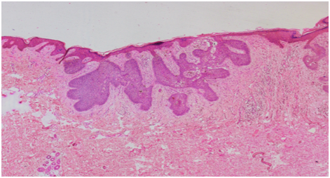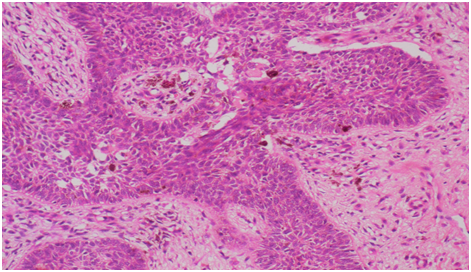 An 80years old male patient presented to our department with a gradually progressive asymptomatic dark colored lesion at the site of black tattoo ink used for marking skin for directing the radiotherapy beam for adenocarcinoma prostate 12years before. His past medical and surgical history included: multiple treated malignancies in last 35 years in the form of Non Hodgkins lymphoma occurred in 1983 treated with CHOP (cyclophosphamide, doxorubicin, vincristine, and prednisone) regimen and radiotherapy, adenocarcinoma of the stomach in 1996 and adenocarcinoma of the rectum in 2003, which were managed with chemotherapy and surgical resection. In 2006 the patient developed an adenocarcinoma of the prostate managed with chemotherapy and radiotherapy. No family history of multiple malignancies was present in parents, siblings or children. Examination revealed a solitary well defined black colored plaque measuring 05cm x 02cm at 11 o’ clock position from umbilicus in umbilical region not associated with any tenderness or overlying ulceration (Figure 1). Dermoscopic examination revealed leaf like areas at the periphery of the lesion, blue grey ovoid nests, absence of pigment network and specks of black and brown pigment (Figure 2). An incisional biopsy was done from the lesion in view of dermoscopic pattern favoring basal cell carcinoma. Histopathology revealed stratified squamous epithelial lining with irregular proliferation of tumour from undersurface of epidermis and extending into dermis (Figure 3). Tumour nests comprised of basaloid cells with peripheral palisading showing mild pleomorphism with high nucleocytoplsmic ratio. Retraction artefact was seen (Figure 4). There was no lymphovascular or perineural invasion. Immunohistochemistry revealed BerEP4 positivity with no loss of BCl2, negative for epithelial membrane antigen and Carcinoembryonic antigen. Histopathological findings were consistent with Basal cell carcinoma. Patient was managed with wide surgical excision of tumour with 05mm margins and post operative histopathology specimen showed all margins free of tumour. Patient is on regular follow up for any recurrence of Basal cell carcinoma at the same or any other site and also other malignancies.