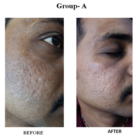 A total of 30 patients of acne scars were enrolled in the study. In both groups–majority (73.3%) between ages of 20-25 years. Both groups- 8 (53%) patients males & 7 (47%) patients females. Majority of patients were Students in group 1 (60%); in group 2, (46.7%) & employee (40%). In Group A-66.7% and in Group B- 80.0% were graduates. Fitzpatrics Skin Type was Type 4 and 5 in all the patients.