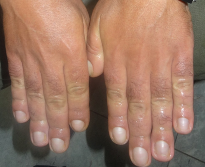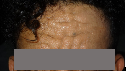 On cutaneous examination, the patient had thickened and moist fingers and toes, digital clubbing, and deep creases on the forehead and scalp (Figures 1–6). Initially, acromegaly was considered; however, the absence of facial features such as an enlarged nose, chin, and tongue made this diagnosis unlikely. Radiographic imaging of the hands and feet showed periostosis of the fingers and toes, confirming pachydermoperiostosis (PDP).