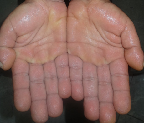 A 22-year-old man presented to our clinic with increased sweating in his hands, and feet which began at the age of 17 years. He is the third of five male siblings, with the exception of the fifth sibling, who did not have similar symptoms. The second and fourth siblings also showed similar, albeit milder, symptoms, while the first and fifth siblings were free of similar symptoms.