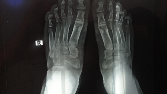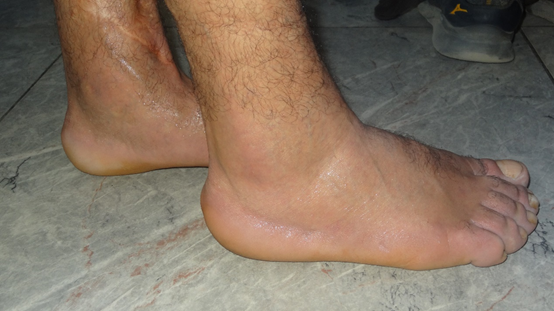Figure 5 Lateral view of the feet, showing hyperhidrosis, clubbing of the toes, and swelling of the ankles (column-like legs).