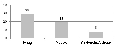 Bacterial infections were mainly manifested as furuncle, folliculitis and impetigo and affected 8 people, or about 2% of those examined. The cause of the folliculitis was not only staphylococcus but fungi too. The main location of these diseases was in the trunk.