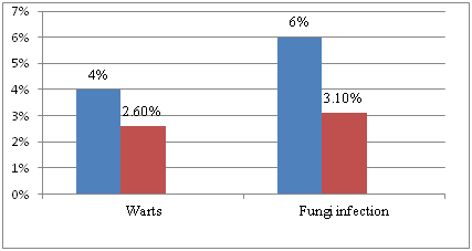 Viral infections represented mostly by the HPV group virus and lesions were found in the palms and soles of patients. Nineteen patients presented with an HPV infection accounted for about 4% of all subjects of this group. Most patients had only one lesion with a major locus in palms or soles. Few patients had multiple wart lesions. More pathological findings were manifested to the soles regarding to the palms.