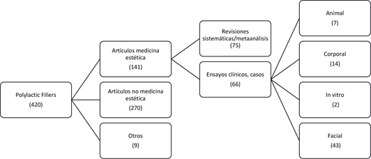 A systematic review of the existing literature was carried out without a time limit, with the aim of obtaining scientific articles related to the efficacy and safety of polylactic acid. These articles were obtained using the polylactic fillers descriptors in the search strategy, in the Medline (PubMed) database until March 2021. 420 articles were obtained from this initial search. Of these, 270 articles were eliminated in which the APLL was not used for aesthetic purposes but for other medical or non-medical uses. In addition, another 9 articles that did not refer to the APLL or that were no longer available were eliminated. After this first filter, 141 articles related to aesthetic medicine remained.