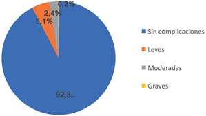 Figure 2 Percentage of patients with complications: 92.3% of the patients did not present complications, in 5.1% they were mild, 2.4% moderate and 0.2% severe.