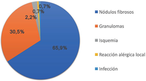Figure 3 Type of complications: The graph shows the distribution of the type of complications: 65.9% were fibrous nodules; 30.5% corresponded to granulomas; 2.2% were ischemic alterations; 0.7% local allergic reactions and 0.7% local infections.
