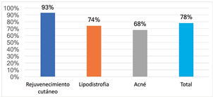 The results obtained from the use of the APLL in this analysis show highly favorable results for its use.41,42 Although the limitations of the present study should not be forgotten; The first is subjectivity, mainly in the evaluation of GA, since the assignment of numerical values followed a semi-quantitative scale adapted for this purpose, as a way of standardizing the values based on the results of the complementary tests and scales. of satisfaction granted by the respective authors. The second to consider is the lack of articles with sufficiently precise CE assessments, especially those referring to acne, which could constitute a bias for the results.