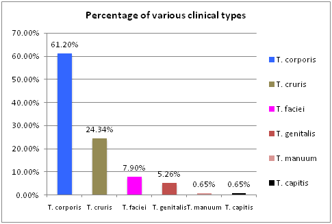 Results: We found that tinea corporis was the most common clinical type (61.20%) and was due to Trichophyton interdigitale (T. interdigitale) except one case, which was due to Trichophyton rubrum (T. rubrum). The next in frequency was tinea cruris (24.34%) due to T. interdigitale. Most of the cases of dermatophytosis were extensive without central clearing and with involvement of multiple anatomical sites. There was only one case of tinea capitis (0.65%) due to Trichophyton violaceum (T. violaceum). We did not find any inflammatory lesions or involvement of lymph nodes.