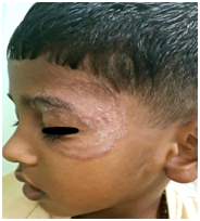 Figure 2 Tinea faciei on the left side of the face of a seven-year-old boy having erythematous double-edged annular scaly plaque without central clearing.
