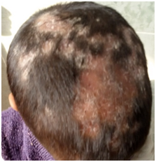A total of 100 patients were consented and enrolled during the period from October 2016 to March 2017, which included 63 males and 37 females. Maximum numbers of patients were found in the age group 16-30 (55), 35 males and 20 females. The youngest patient was one-year old female child with tinea corporis and the eldest was 60 years old female with extensive tinea corporis. The study indicates that dermatophytosis is more common in males (63%) than in females (37%). Multiple anatomic site involvement was seen in 46 patients, 30 males and 16 females. The lesions were extensive and without central clearing. The total number of clinical types was 152, which was higher than the total number of patients. Tinea corporis was the commonest clinical type (61.20%) (Figure 1) observed followed by tinea cruris (24.34%), tinea faciei (7.90%) (Figure 2), tinea genitalis (5.26%) (Figure 3) (Figure 4) tinea manuum and tinea capitis (0.65%) (Figures 5) (Figure 6) (Table 1).